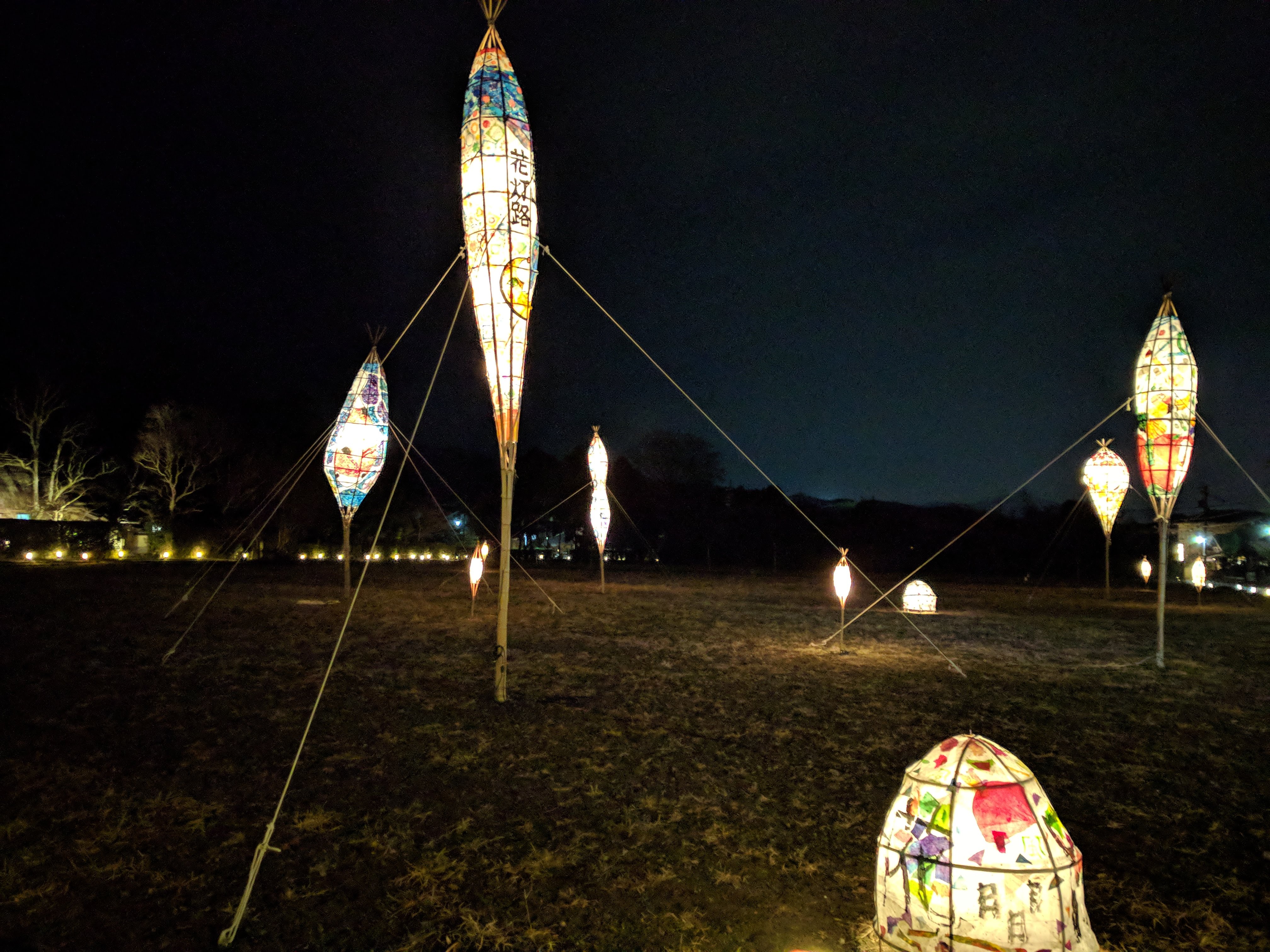 After you pass through the forest, you can follow the paths back towards the station, which are lit by lanterns. There, you will pass by lots of different things, like the weird lanterns in the picture on the right, as well as a display with some strange porcelain dolls. There’s also a very still pond which reflects all of the lit up trees and I think looks pretty, though Kyo said it was creepy.